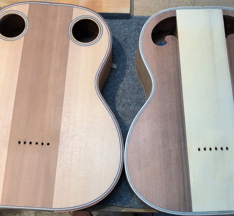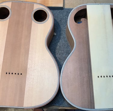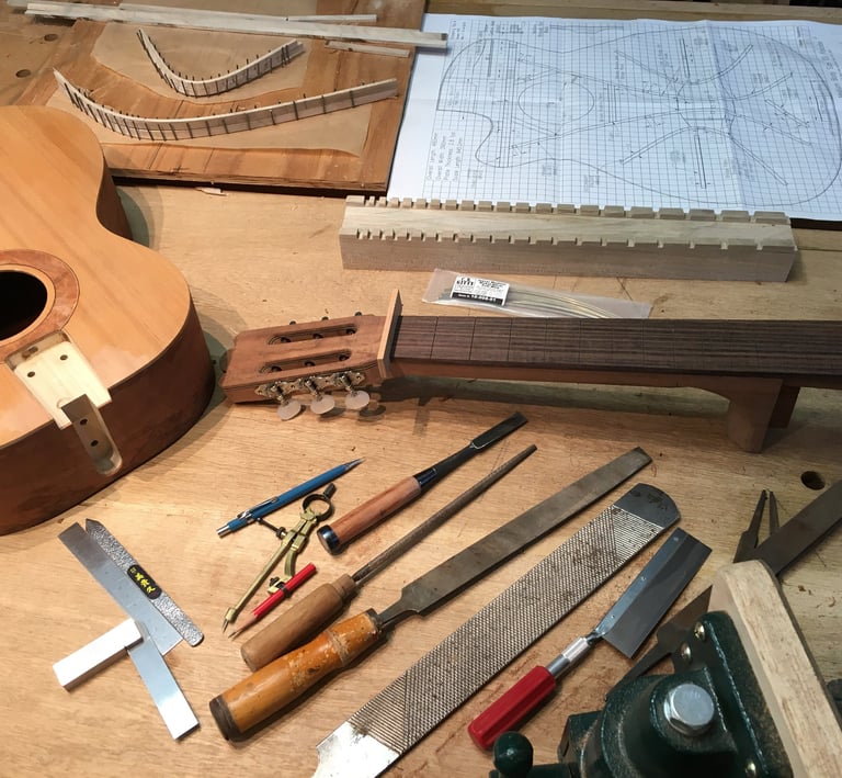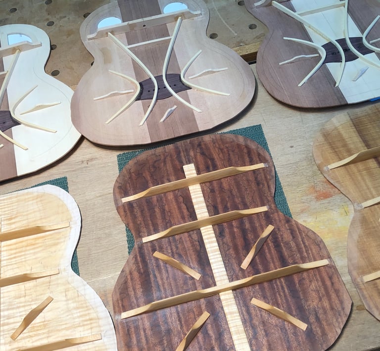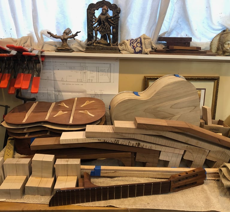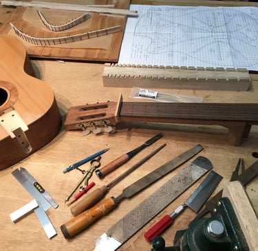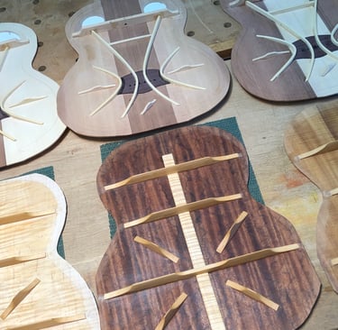 Using my experience in sculpture and woodworking, I built the guitar I couldn't find in a store. The process was transformative. I quickly fell in love with the technical alchemy of instrument building-learning how subtle changes in wood and geometry can completely redefine the sound and "feel' of a guitar. My process is focused on mastering the intricate variables of construction that dictate an instrument's unique tonal character and playability.